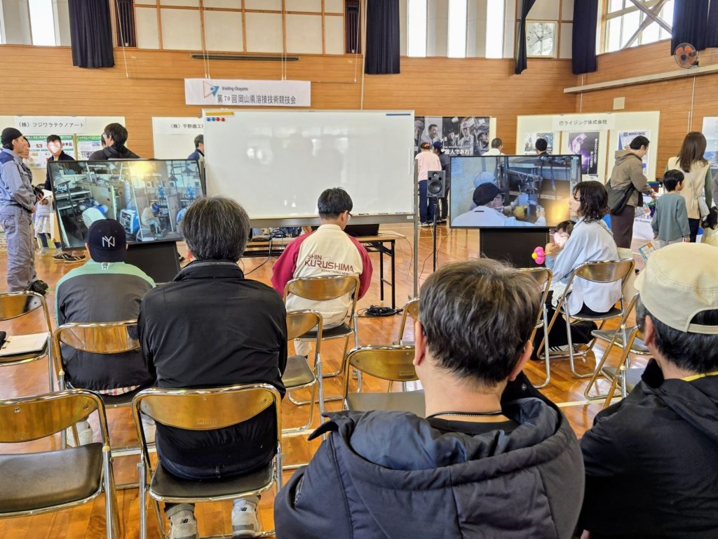 また、会場内に設置された2台の大型モニターでは、4つの時間帯に分かれて行われた「岡山県溶接技術競技会」の様子をリアルタイム放映。総勢35名(手溶接18名、半自動溶接17名)の選手が順次、その腕を競い合いました。